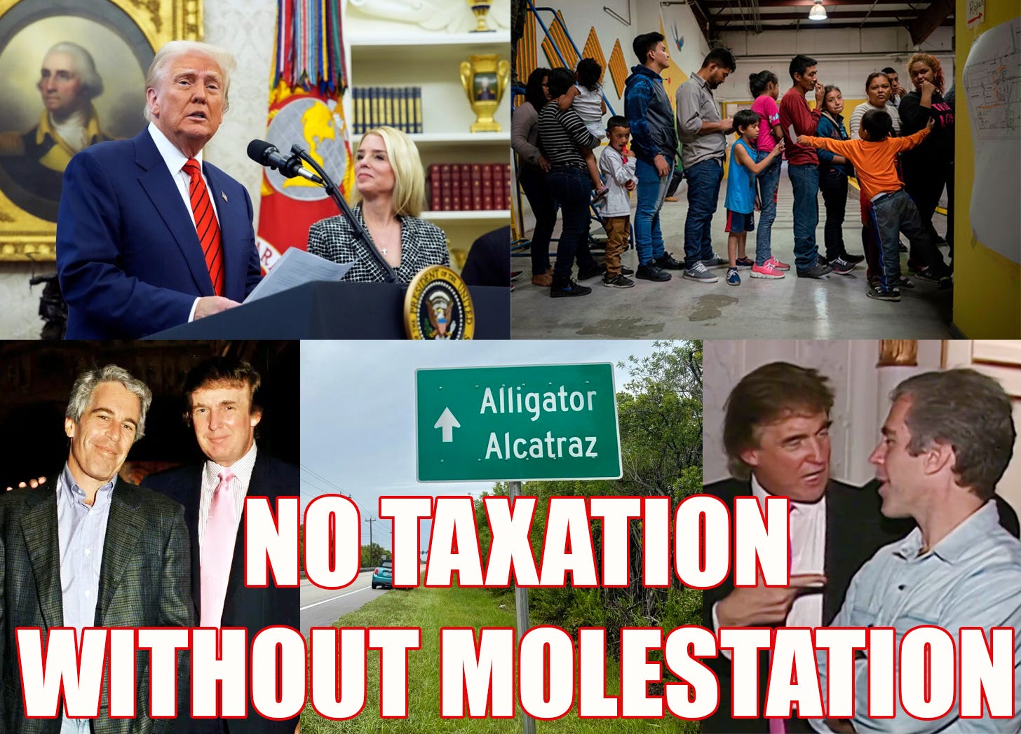 “Thank you, Mr. President. Alligator Alcatraz has partnered with Disney’s Fantasyland—the original small world people. See what we did there?! Look—these kids are getting deported anyway. Everything is provided. Trump Baby Oil. Trump Towels. I framed mine. I call it “Crusty.’”